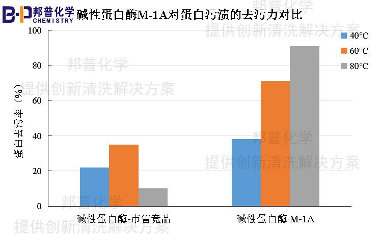 (2)碱性蛋白酶M-1A耐高温,短时间可耐受80℃高温(具体耐受温度跟配方体系等多因素有关,需要实验确定,仅供参考),高温工况下去污力强